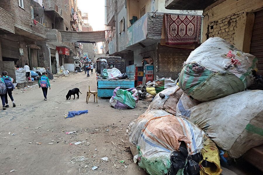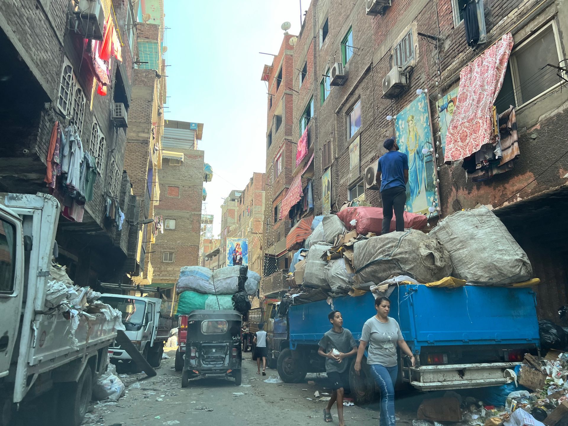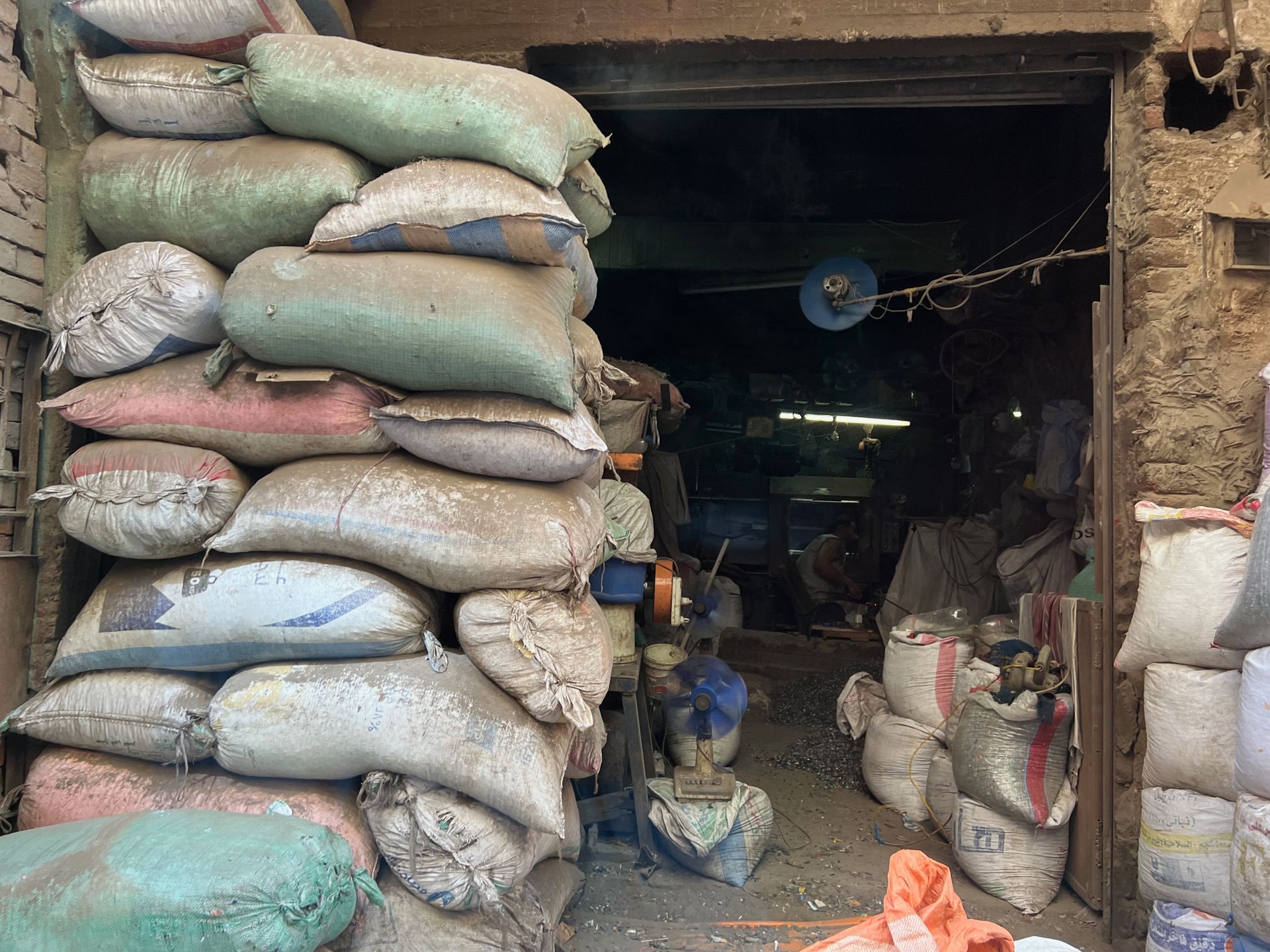 Children in this community join their parents from an early age in their work and have few educational opportunities. Driving through this neighborhood takes patience, as many loaded trucks block the narrow streets. More than 14,000 tons of mixed garbage passes through the neighborhood each day. That’s about 85% of all the waste produced by Cairo’s 22 million residents. Here it is sorted, cleaned, processed, and converted into recycled plastic, or moved on to other factories as recycled raw materials to produce other goods. Everyone here in this enclave of 70,000 people has a part to play in the seven stages of recycling: collection, transport, sorting, crushing, washing, processing, and production. An especially valued commodity are plastics which are shredded, washed, compressed into pellets, and then turned into products like plastic hangers, plastic bags, flip-flops, etc.