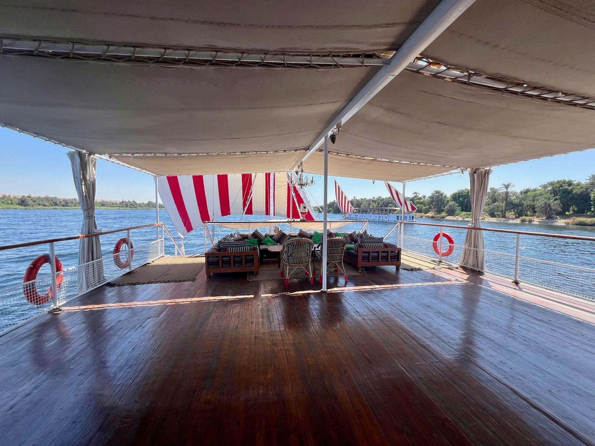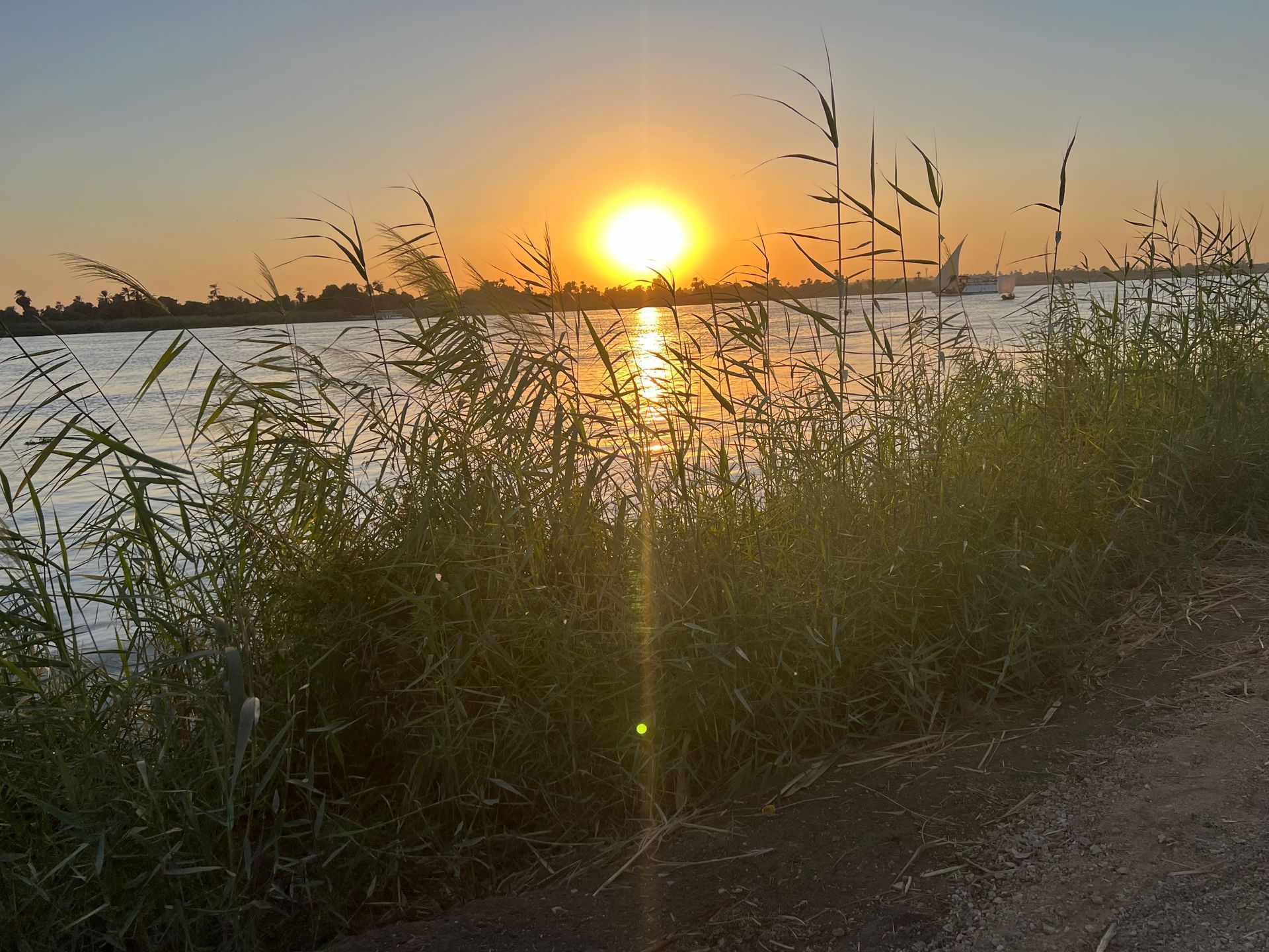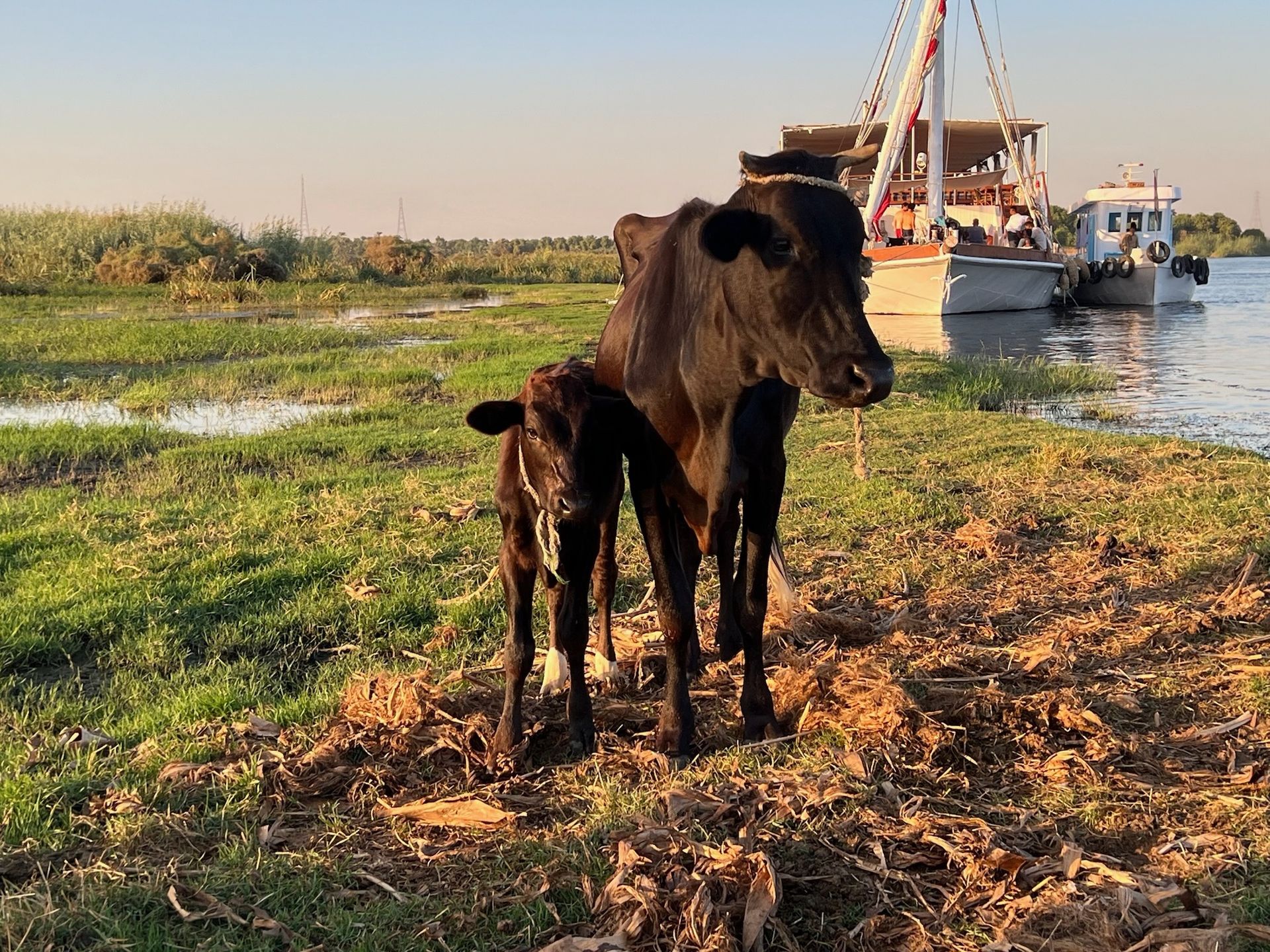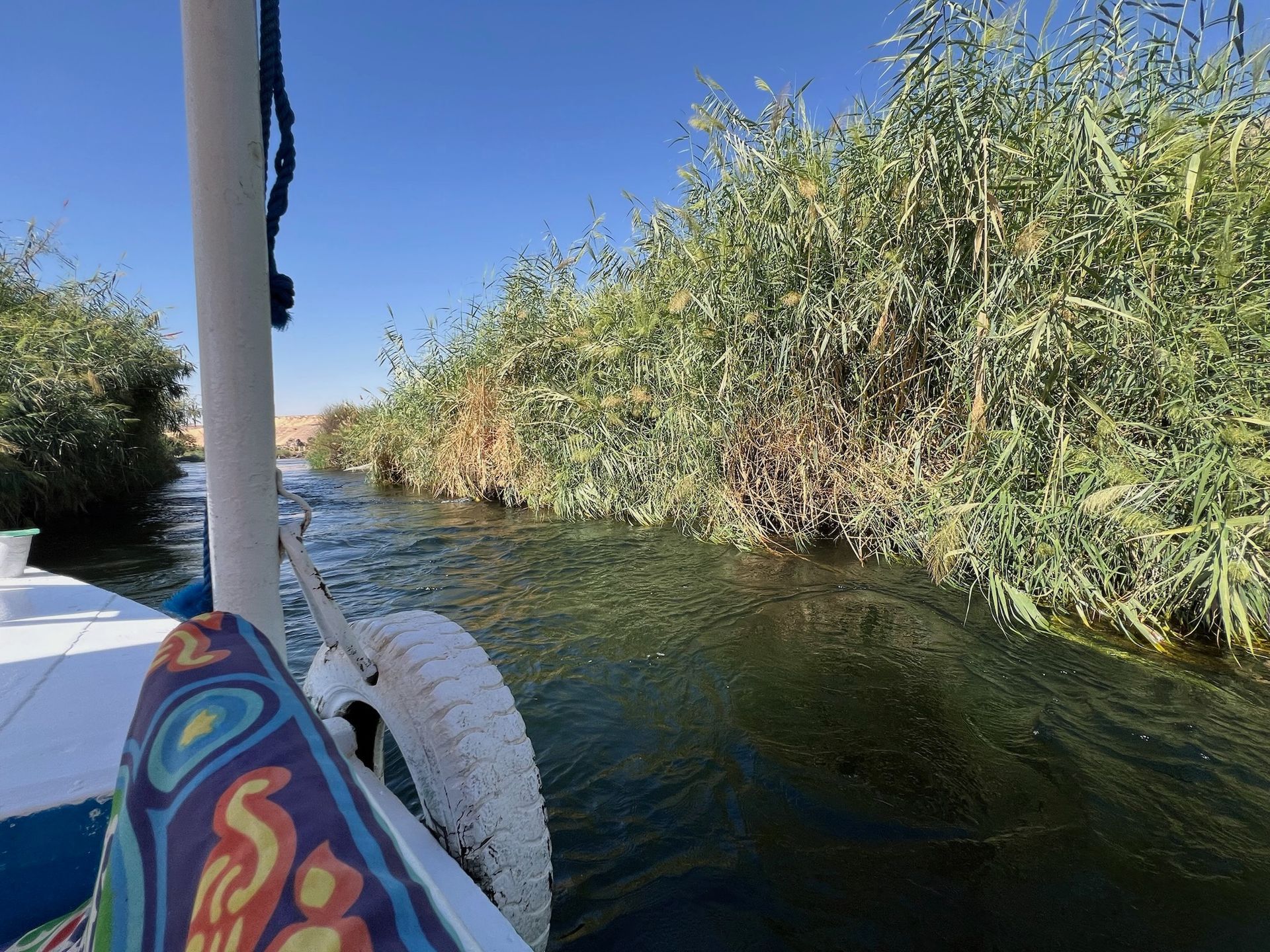 Our boat journey was super relaxing. Much of the time the wind is not strong enough to move the boat despite its two large sails and the dahabiya get towed by a tugboat. Even when there is sufficient wind, the average speed appears to be around 5 mph. The landscape passes by slowly – lots of date palms, fruit trees, marshes, sugar cane fields, plus tall grasses and papyrus on the banks of the Nile. We are also passing numerous shallow islands with donkeys, buffalos, cows, and horses lazily grazing on them. Apparently, they are able to swim in the river despite the strong current. When I tried to do the same, just for a minute or two, I got scared and the strong arms of a crew member pulled me back to the shore. With a bit more courage, I could have done the same as other passengers – be driven a bit upstream and float back to the boat. Alas, at least Anna and I can say that we went into the water and swam in the Nile!