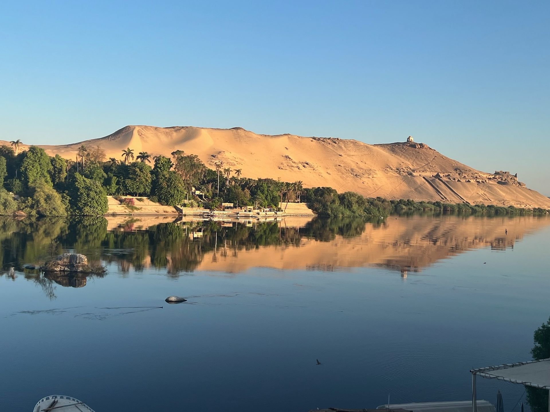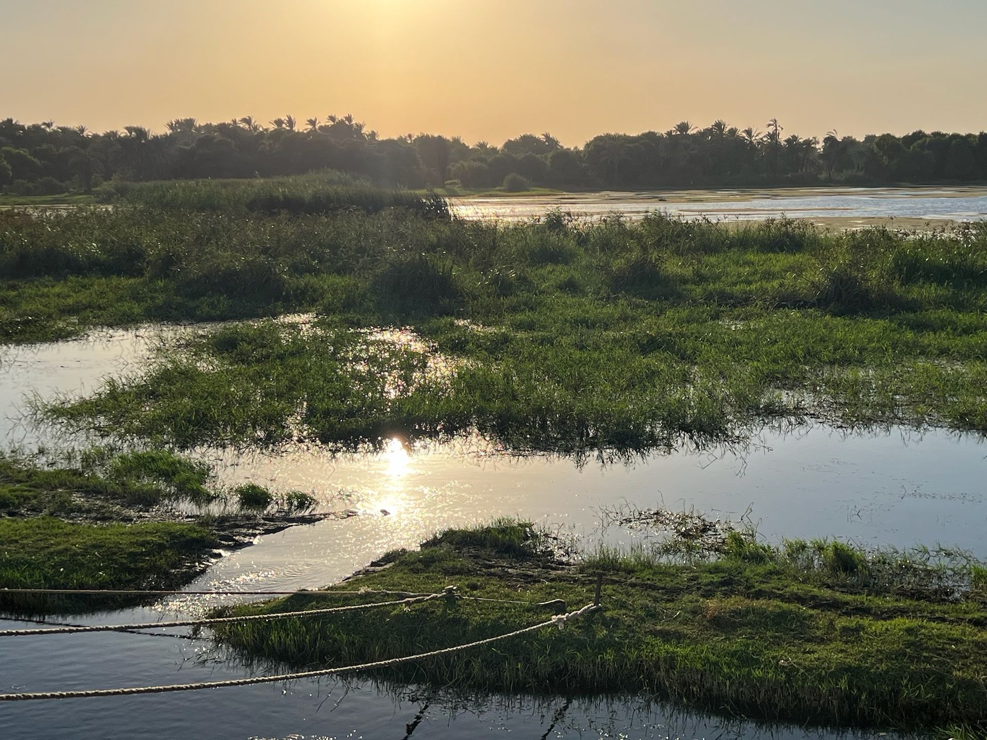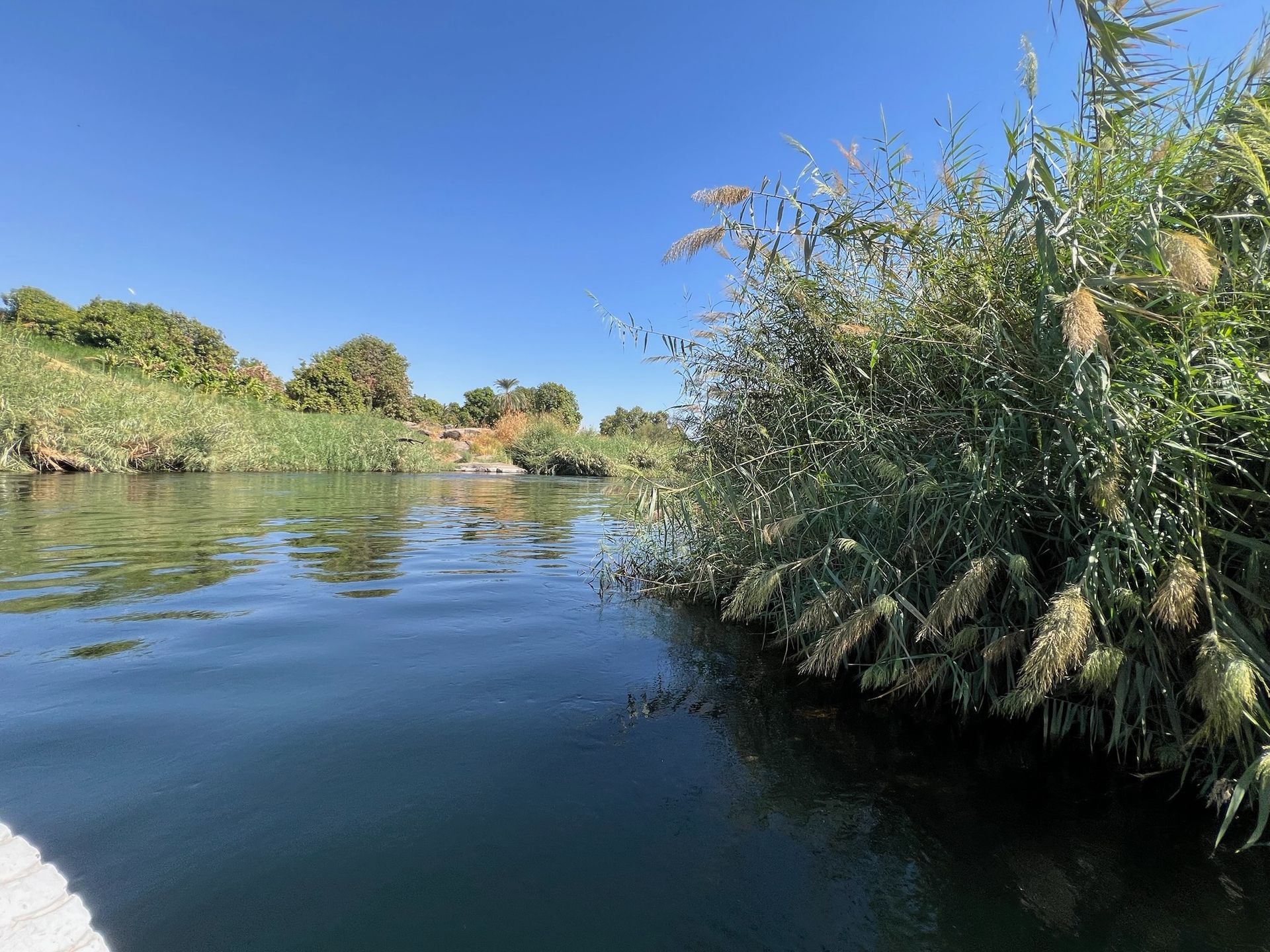 Our boat journey was super relaxing. Much of the time the wind is not strong enough to move the boat despite its two large sails and the dahabiya get towed by a tugboat. Even when there is sufficient wind, the average speed appears to be around 5 mph. The landscape passes by slowly – lots of date palms, fruit trees, marshes, sugar cane fields, plus tall grasses and papyrus on the banks of the Nile. We are also passing numerous shallow islands with donkeys, buffalos, cows, and horses lazily grazing on them. Apparently, they are able to swim in the river despite the strong current. When I tried to do the same, just for a minute or two, I got scared and the strong arms of a crew member pulled me back to the shore. With a bit more courage, I could have done the same as other passengers – be driven a bit upstream and float back to the boat. Alas, at least Anna and I can say that we went into the water and swam in the Nile!
