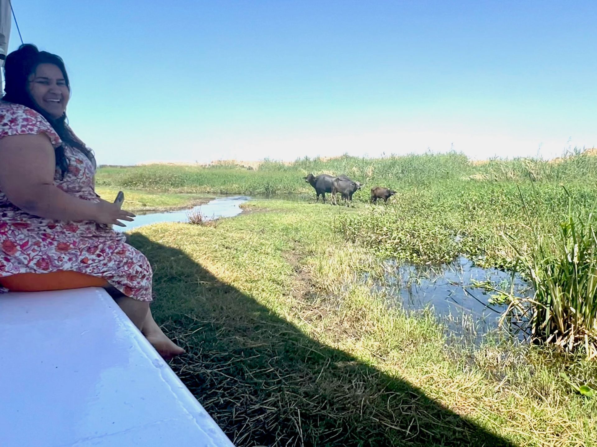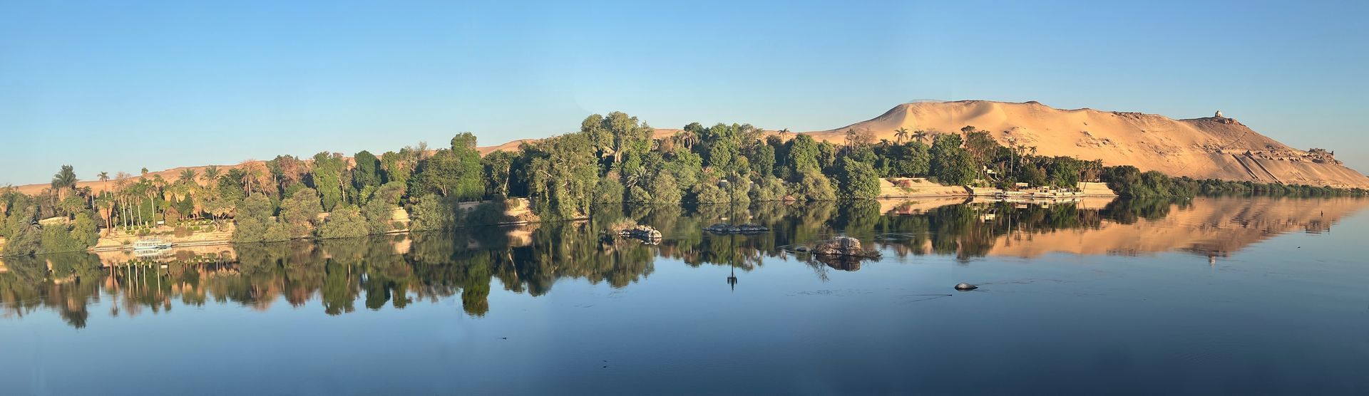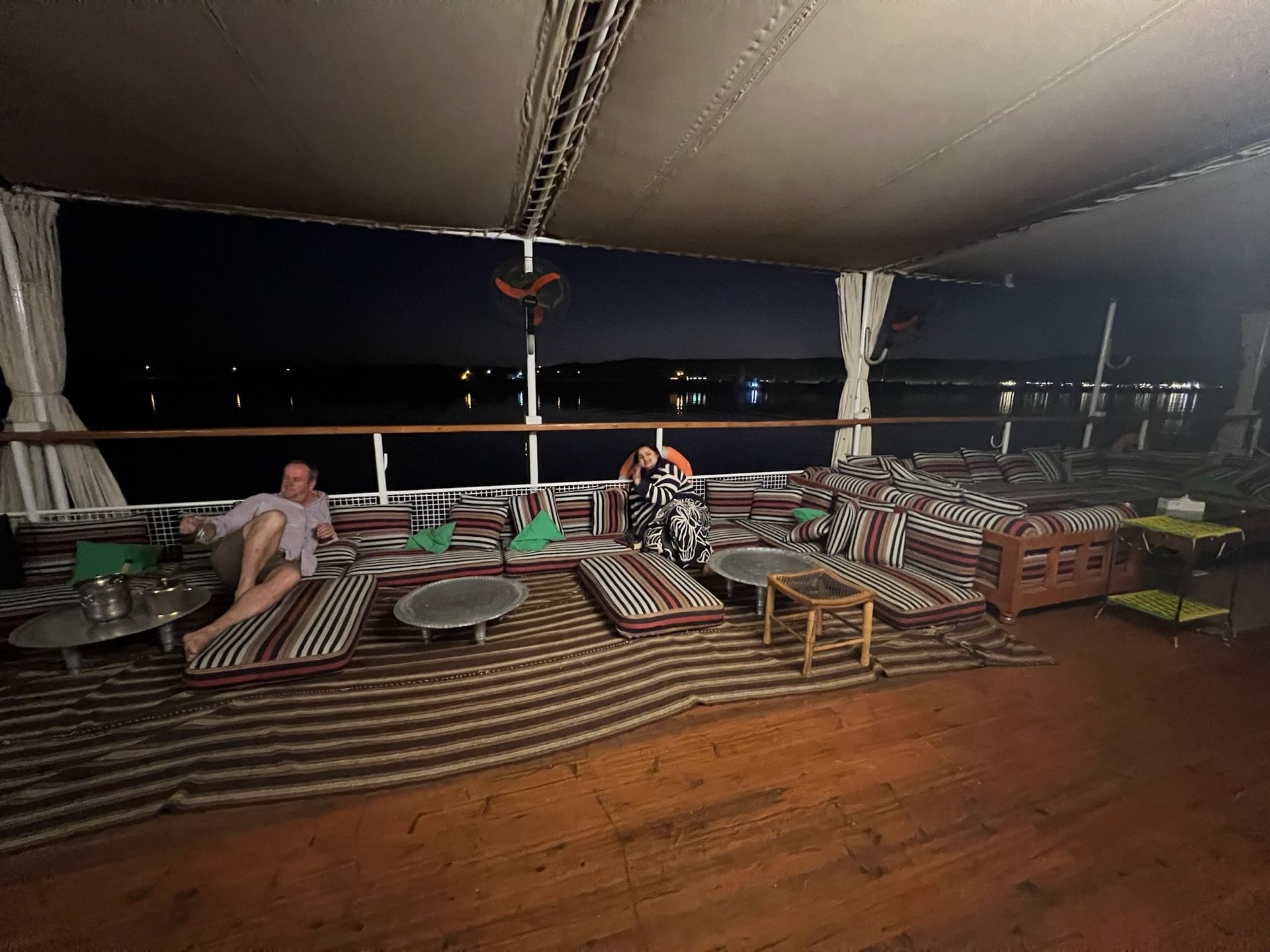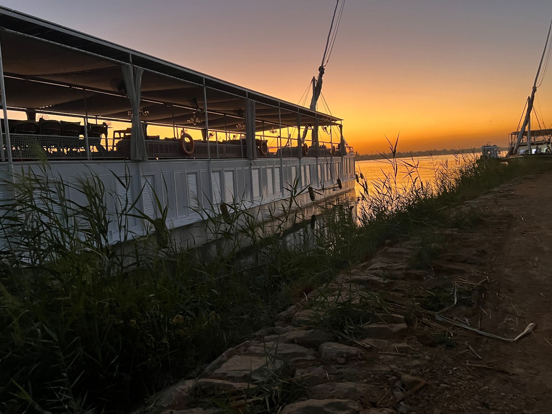 Our boat journey was super relaxing. Much of the time the wind is not strong enough to move the boat despite its two large sails and the dahabiya get towed by a tugboat. Even when there is sufficient wind, the average speed appears to be around 5 mph. The landscape passes by slowly – lots of date palms, fruit trees, marshes, sugar cane fields, plus tall grasses and papyrus on the banks of the Nile. We are also passing numerous shallow islands with donkeys, buffalos, cows, and horses lazily grazing on them. Apparently, they are able to swim in the river despite the strong current. When I tried to do the same, just for a minute or two, I got scared and the strong arms of a crew member pulled me back to the shore. With a bit more courage, I could have done the same as other passengers – be driven a bit upstream and float back to the boat. Alas, at least Anna and I can say that we went into the water and swam in the Nile!