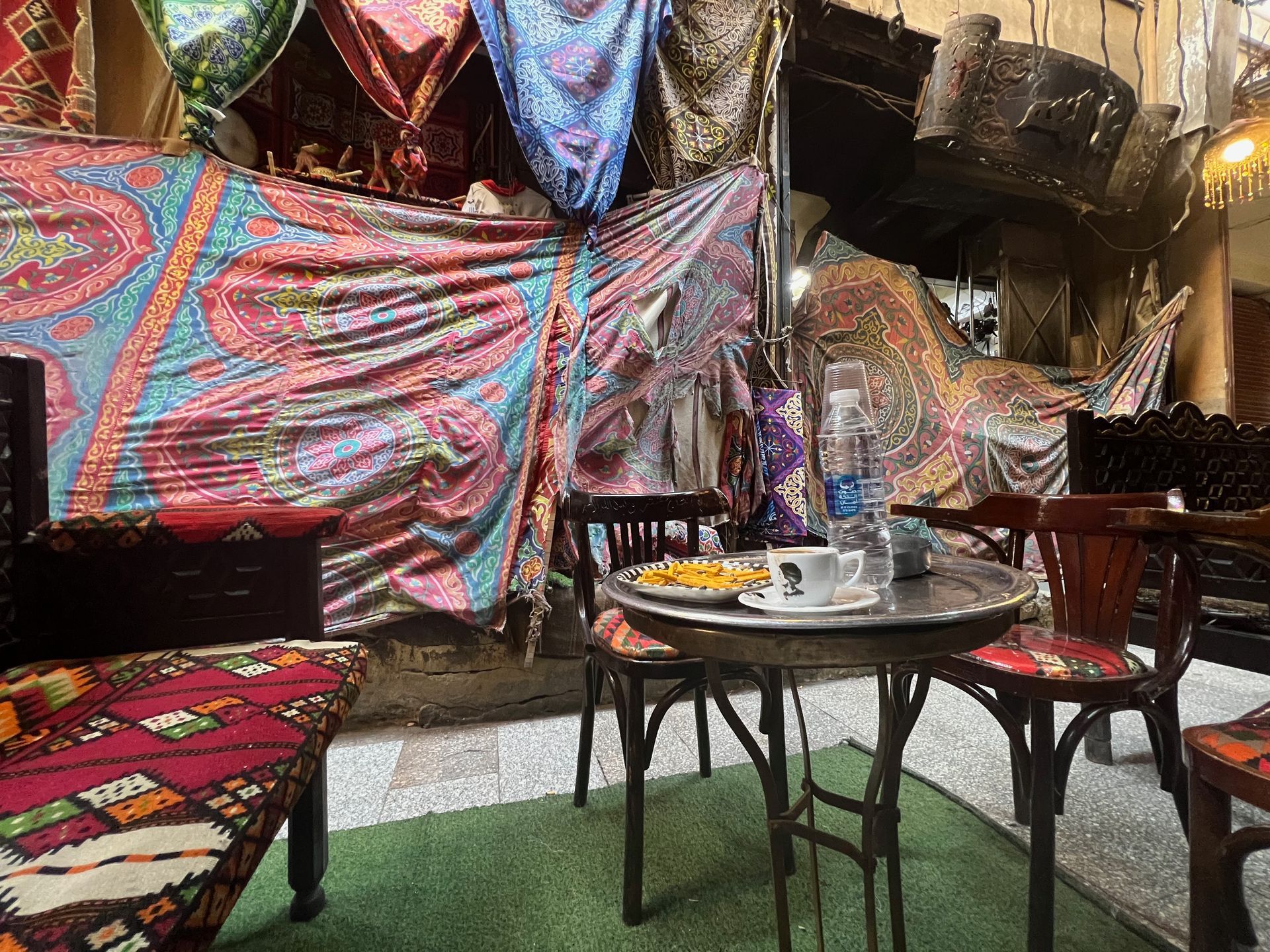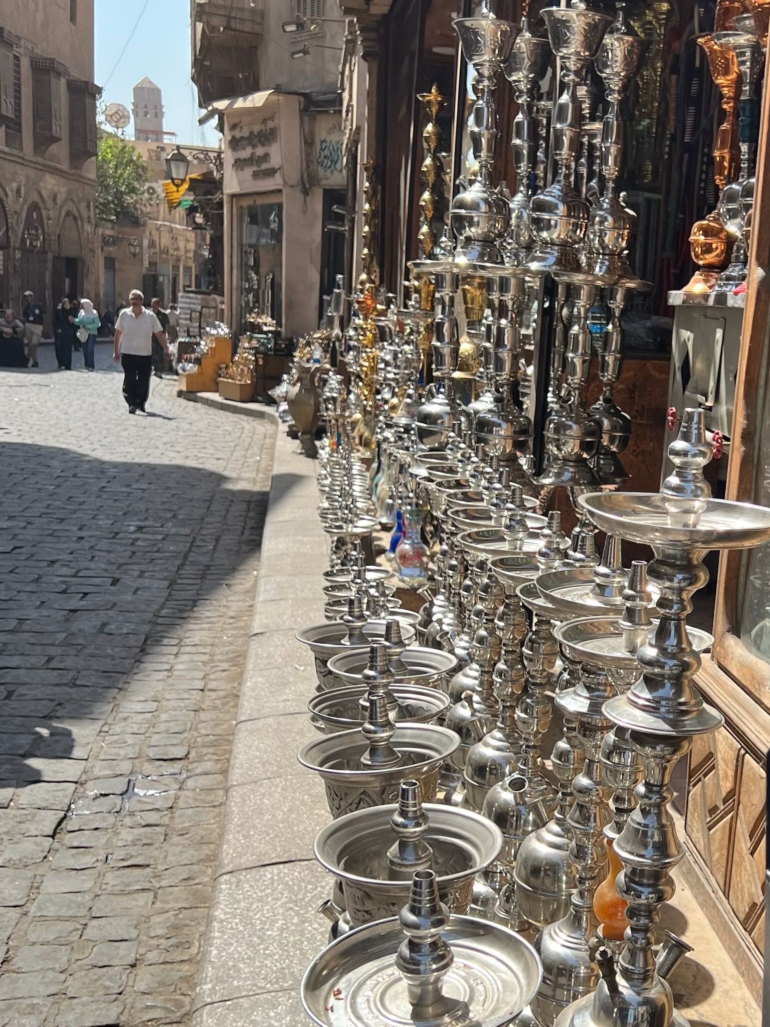 Cairo’s famous “Khan al-Khalili” bazaar is not for the faint-at-heart or polite tourist. The ever-present vendors appear to bring out the worst in me, my rude side. Hence, I did not spend as much time there as I had anticipated. I saw hardly anything that seemed worth buying. Most of the goods are mass-produced (possibly in China) and come in garish colors. I hope to find other areas with more local products. Two things I liked very much, however, were my coffee and lunch spots- a small cafe on a side-street near the better-known Al-Fishawy Café and the very touristy “Egyptian Pancake House” which serves savory and sweet flaky “feteer.” I enjoyed Rumi-cheese- and-vegetable-stuffed and honey-and-sweet cream-topped versions.