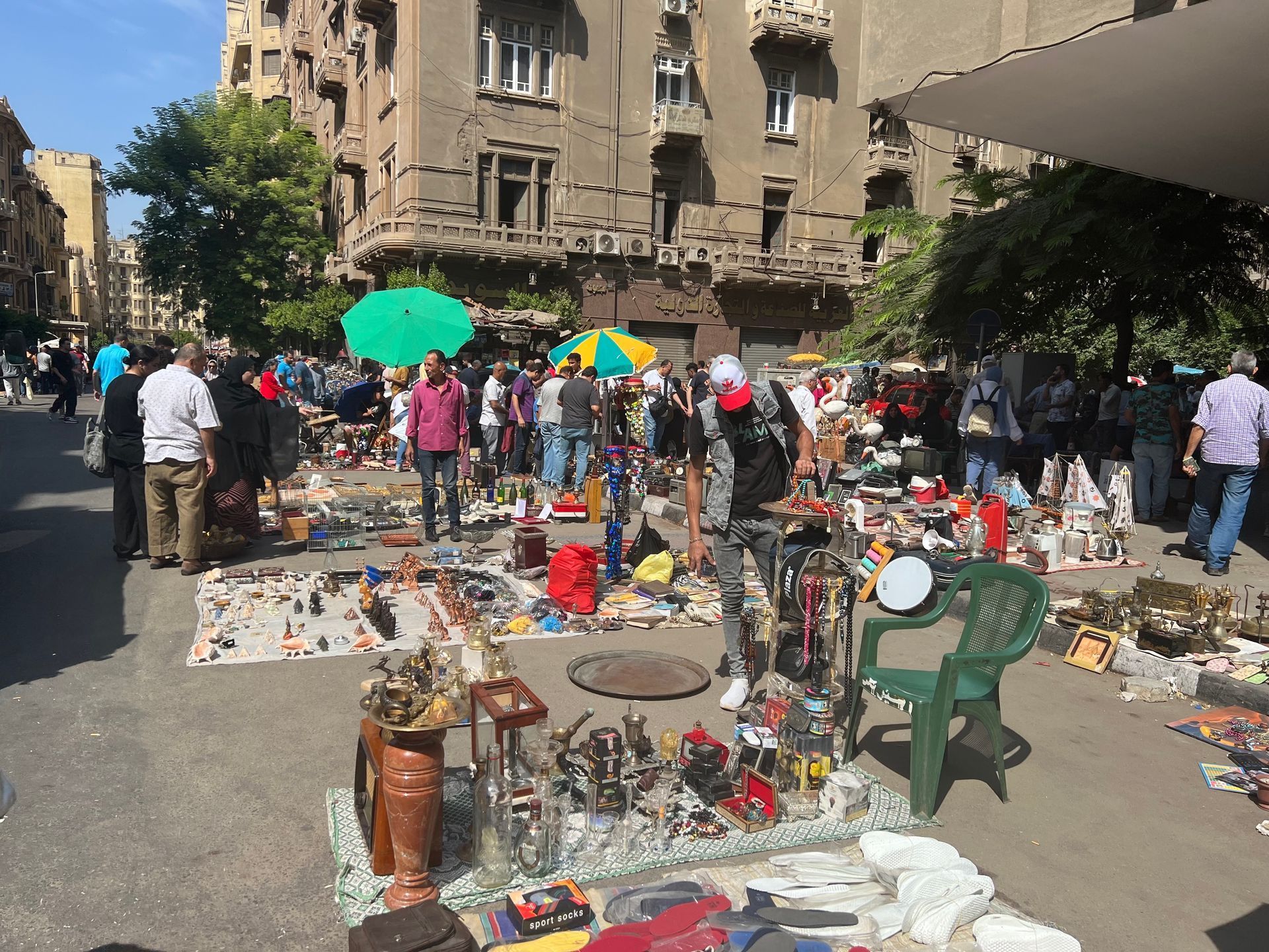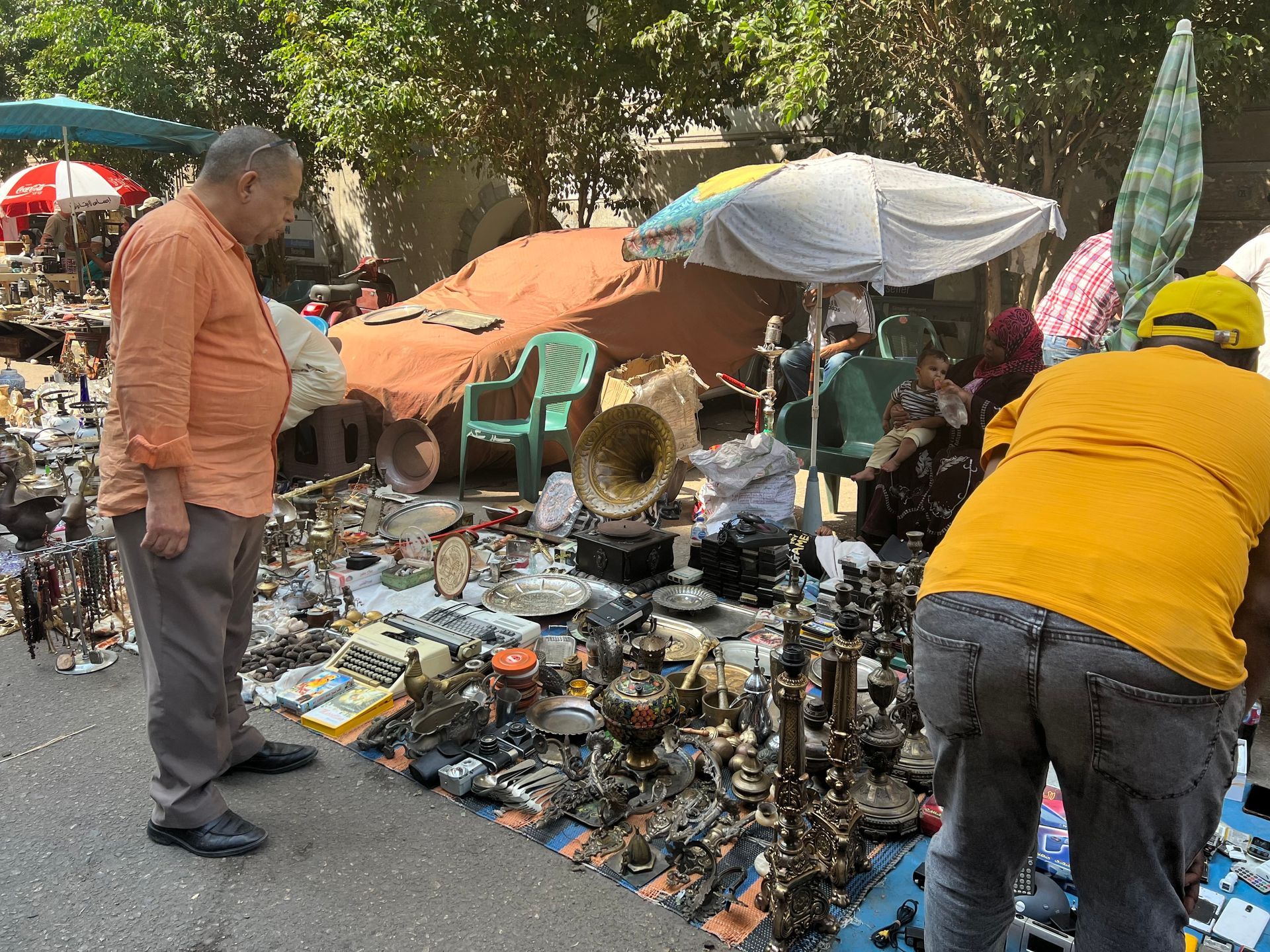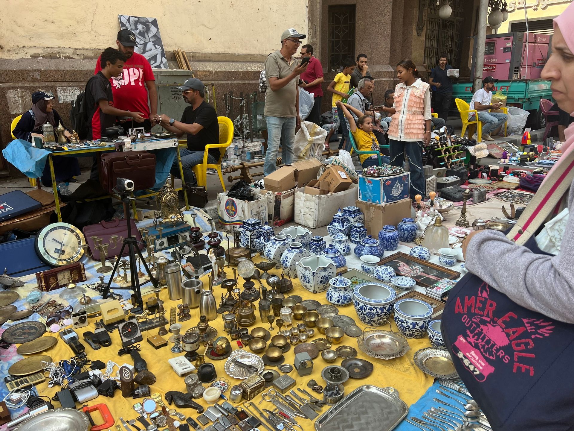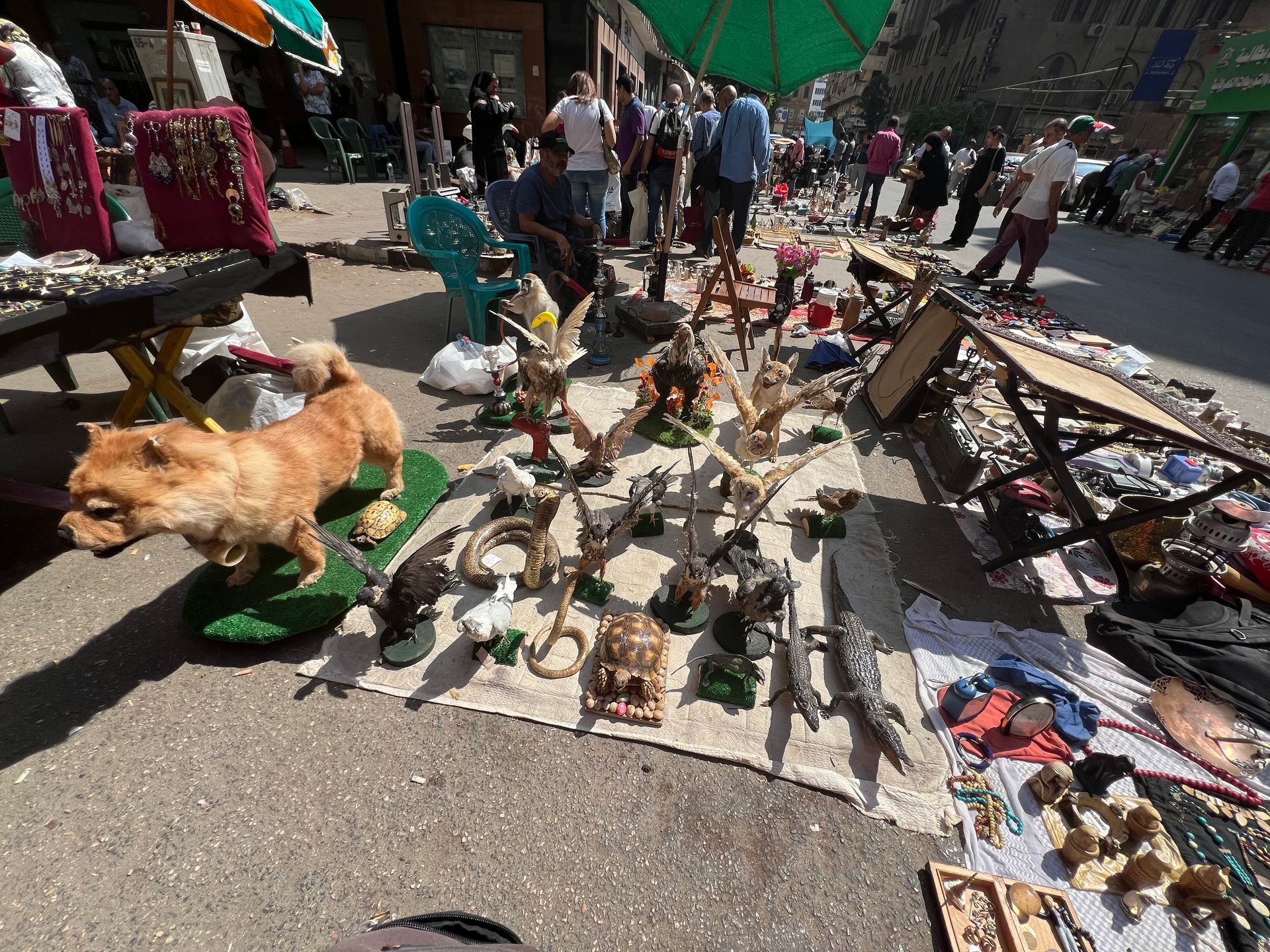 The first of these was the Saturday Market near the (closed) Diana Palace Cinema – several blocks of vendors. Some of them had spread out their wares on the ground, others had created an elaborate antique shop atmosphere with furniture defining the space. Items ranged from used tourist souvenirs, glass, porcelain, taxidermy items, electronics, car parts, Sterling silver jewelry (by weight), and coins to old bank notes and stamps. In typical Cairo fashion, the streets were open to traffic. Honking cars and motorbikes were slowly trying to squeeze through the crowds.