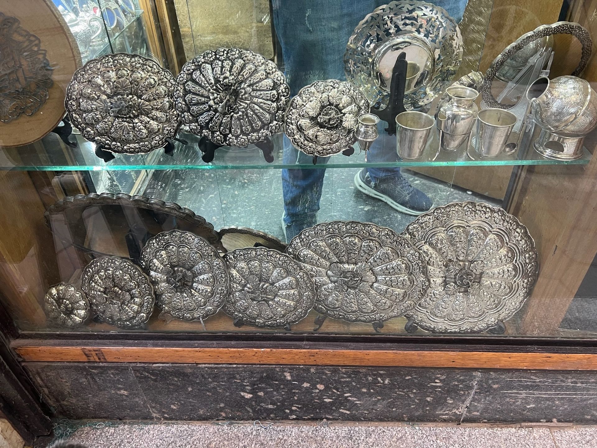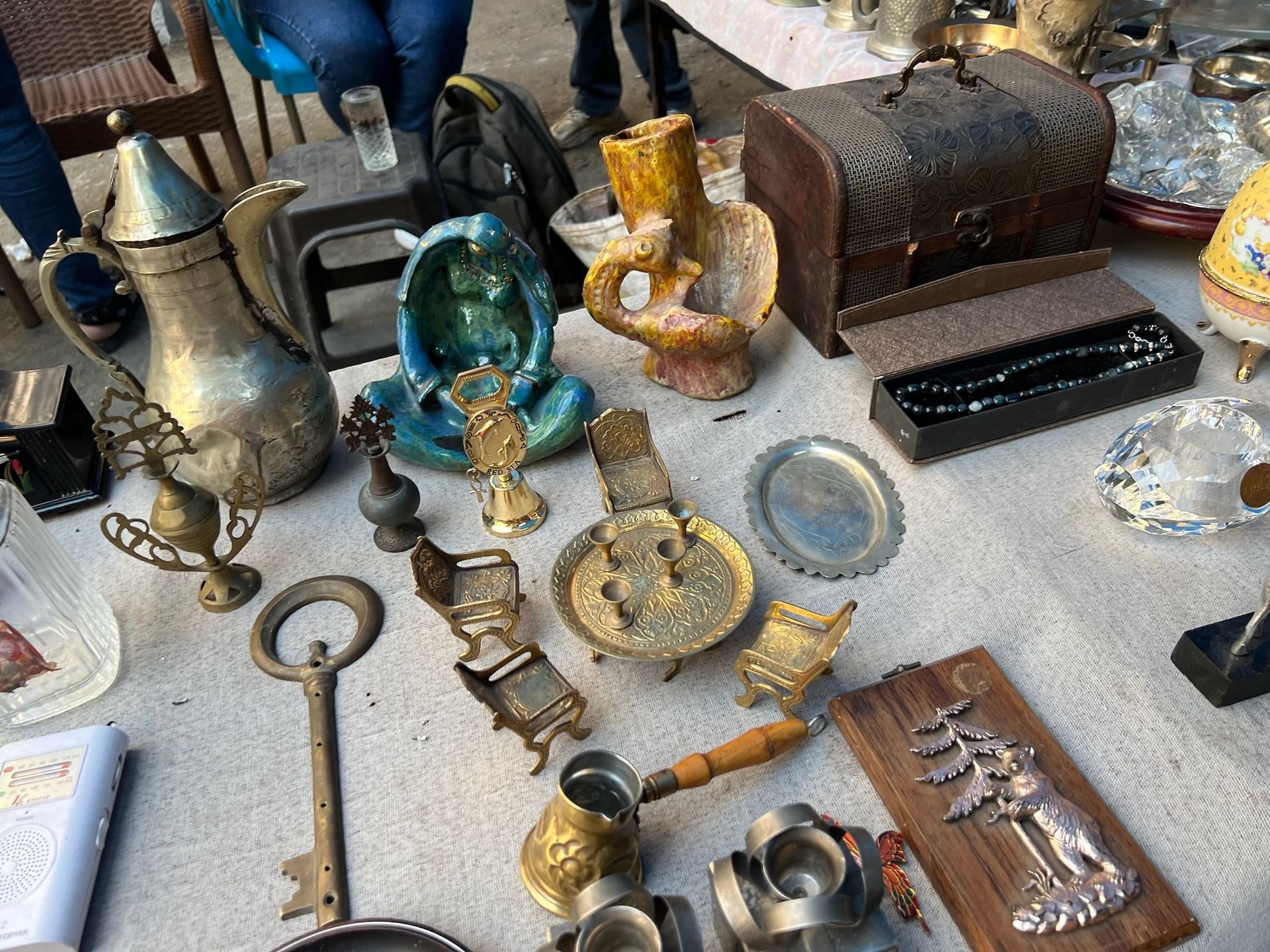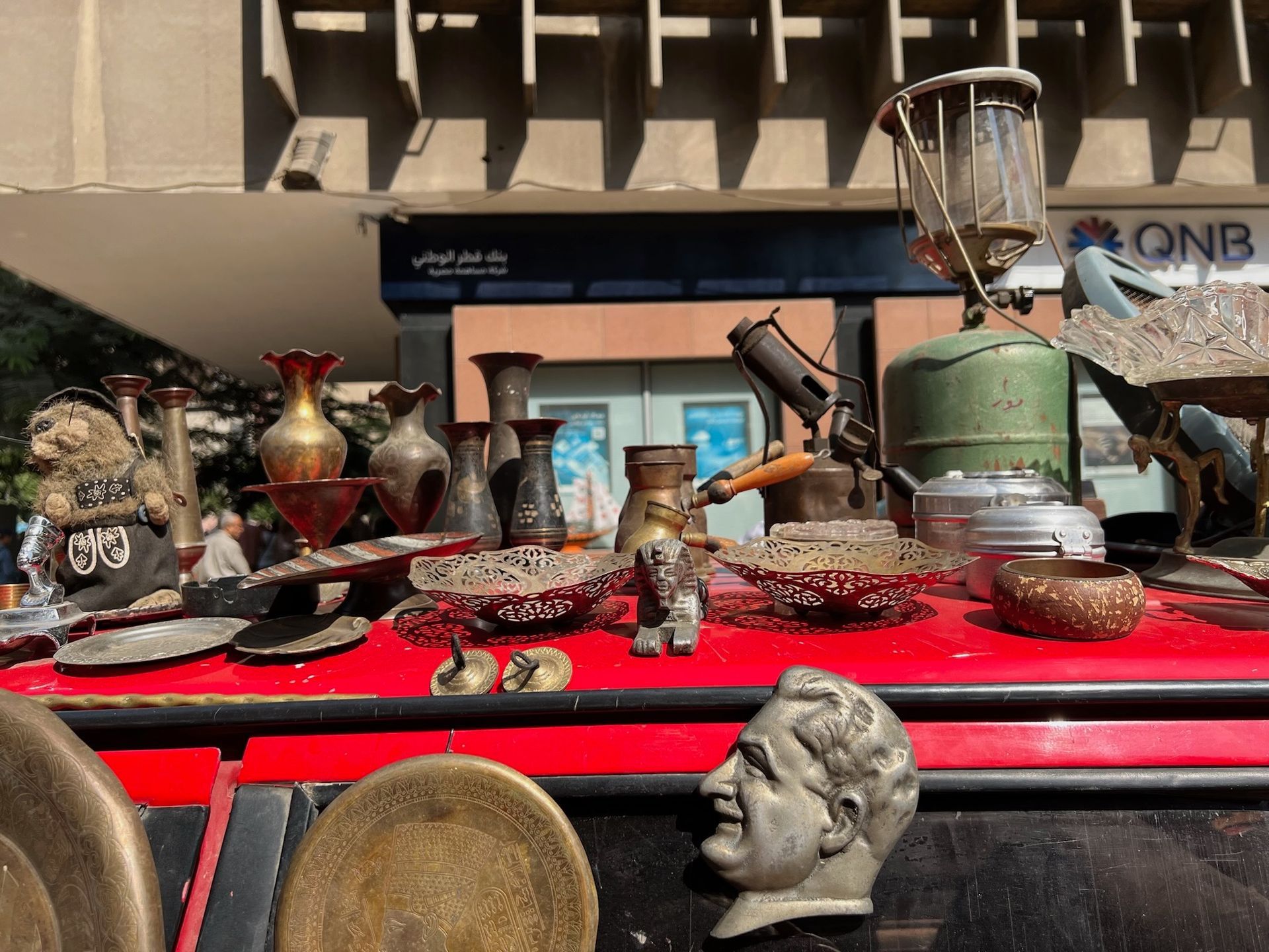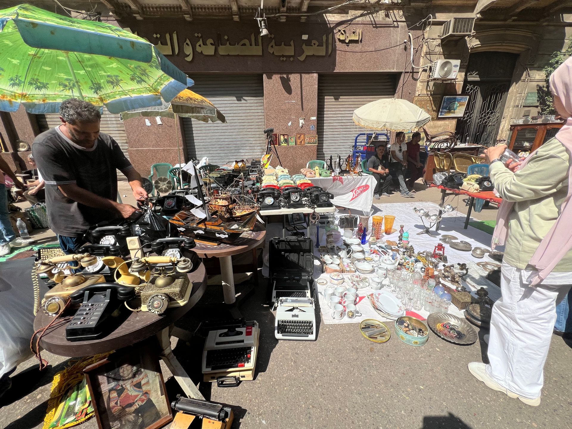 The first of these was the Saturday Market near the (closed) Diana Palace Cinema – several blocks of vendors. Some of them had spread out their wares on the ground, others had created an elaborate antique shop atmosphere with furniture defining the space. Items ranged from used tourist souvenirs, glass, porcelain, taxidermy items, electronics, car parts, Sterling silver jewelry (by weight), and coins to old bank notes and stamps. In typical Cairo fashion, the streets were open to traffic. Honking cars and motorbikes were slowly trying to squeeze through the crowds.