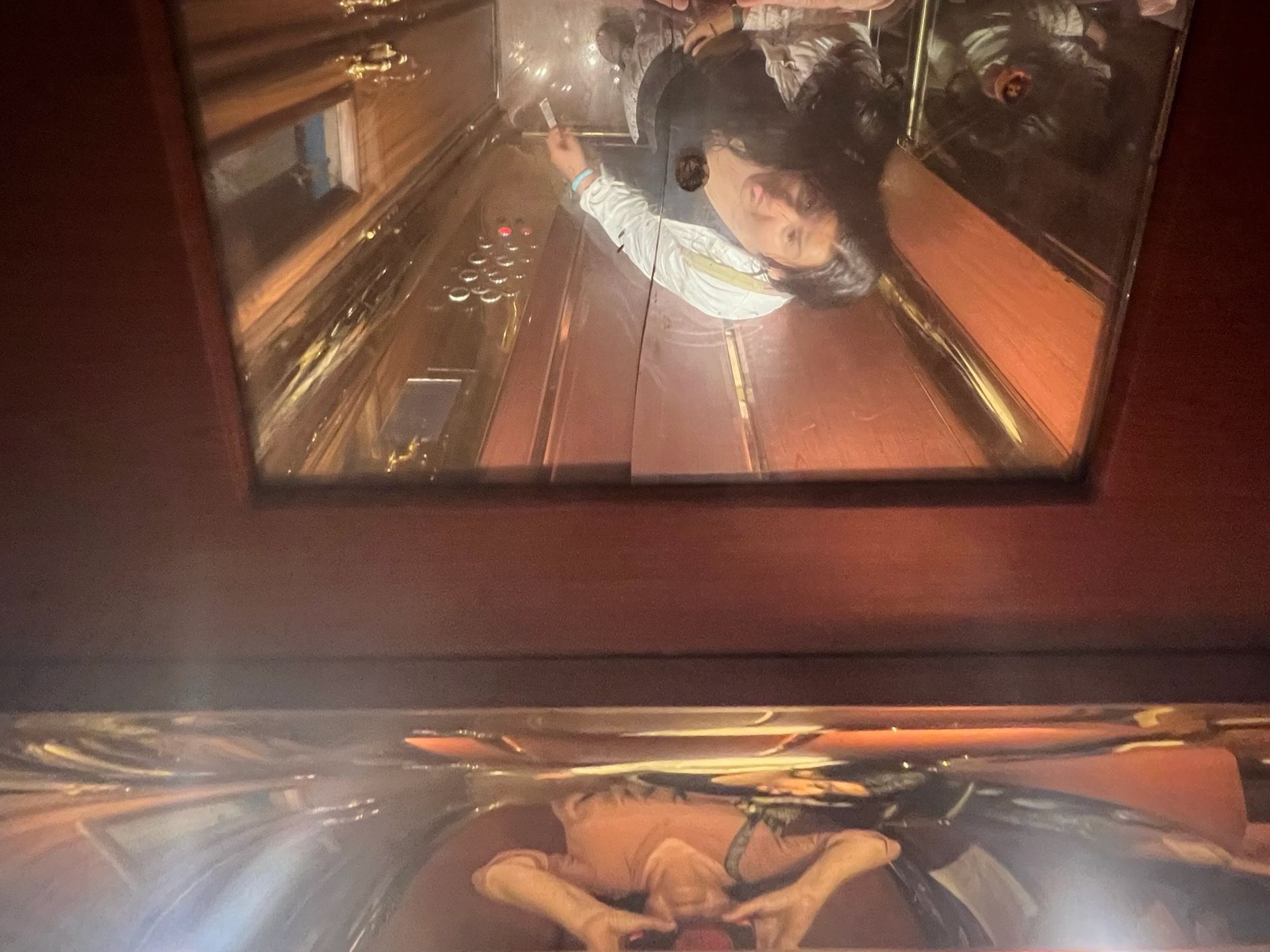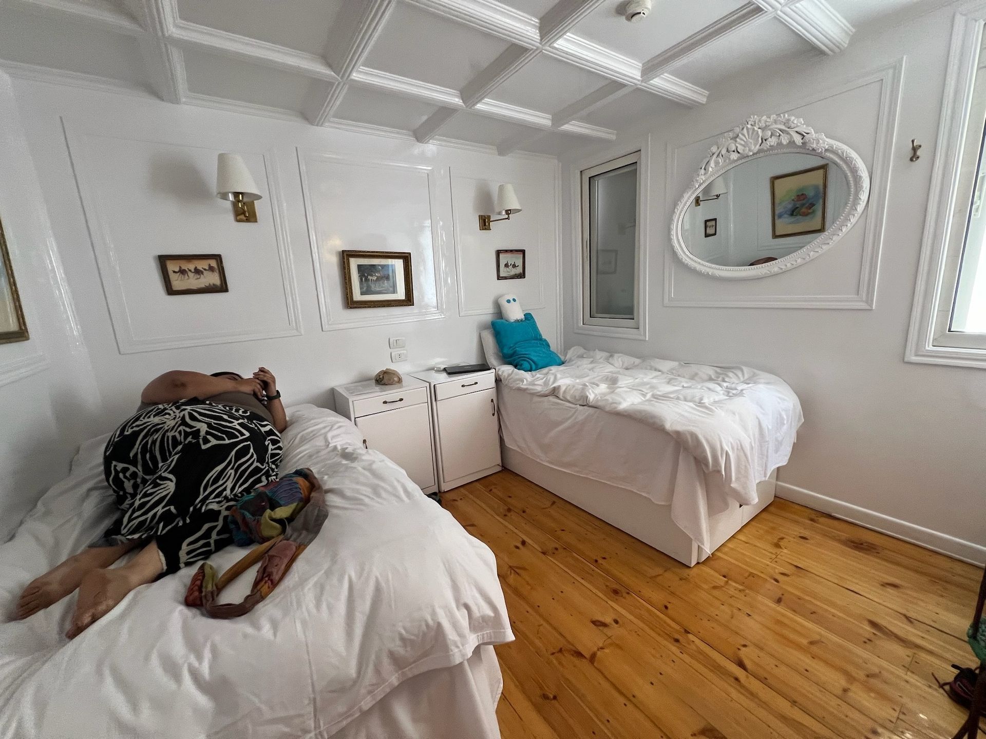 Meals are taken family style around a very long table to accommodate all 16 guests on board. A little more than half of the passengers are French, the remainder, Italian, North American, and Australian. The food is great, the staff super-attentive, and the rooms and common areas well equipped. Anna is by far the youngest passenger on board, as well as the only person of color.