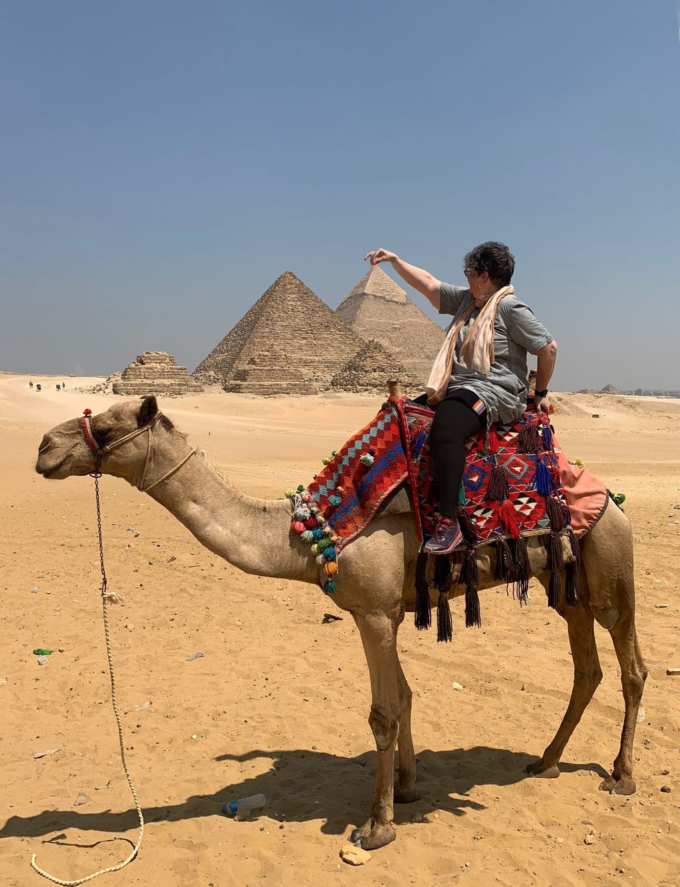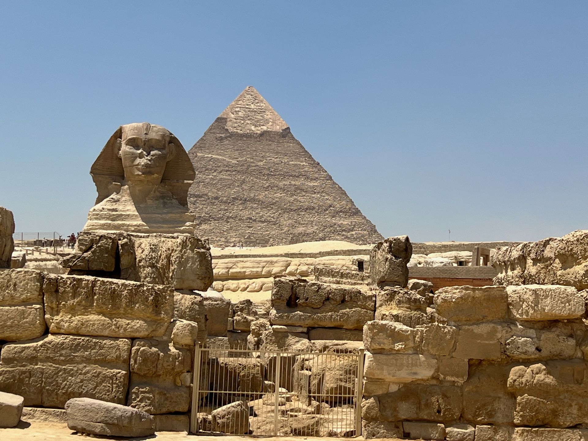 And then came a memorable camel adventure. I had the opportunity to ride a camel for some 20-30 minutes and see the back of the pyramids. While this wasn’t my first time on a camel and not even my longest ride, I certainly felt the effects of aging on my body. Getting up wasn’t as easy as it used to be. Thankfully, I was prepared for the camel’s hind legs to get up first and managed to hold on to the saddle. According to the handler, my camel’s name was Michael Jackson and its butt-sniffing, teeth-flashing companion “Casanova.” Both of them were led down and up the sand dunes. When going down, I had to lean back, while going uphill involved leaning forward. The camel ride was followed by a short drive and visit to the famous sphinx built to protect the pyramids.