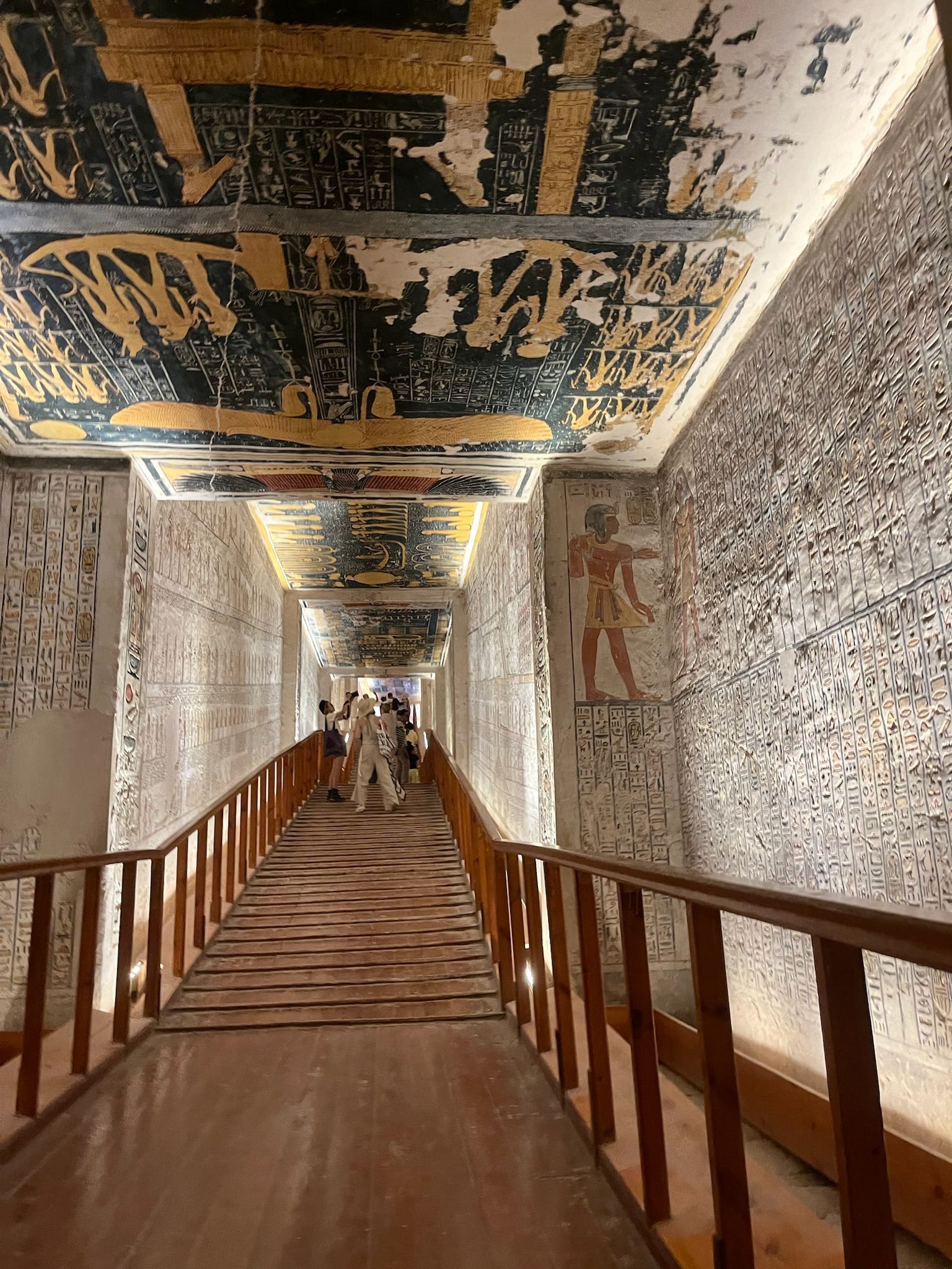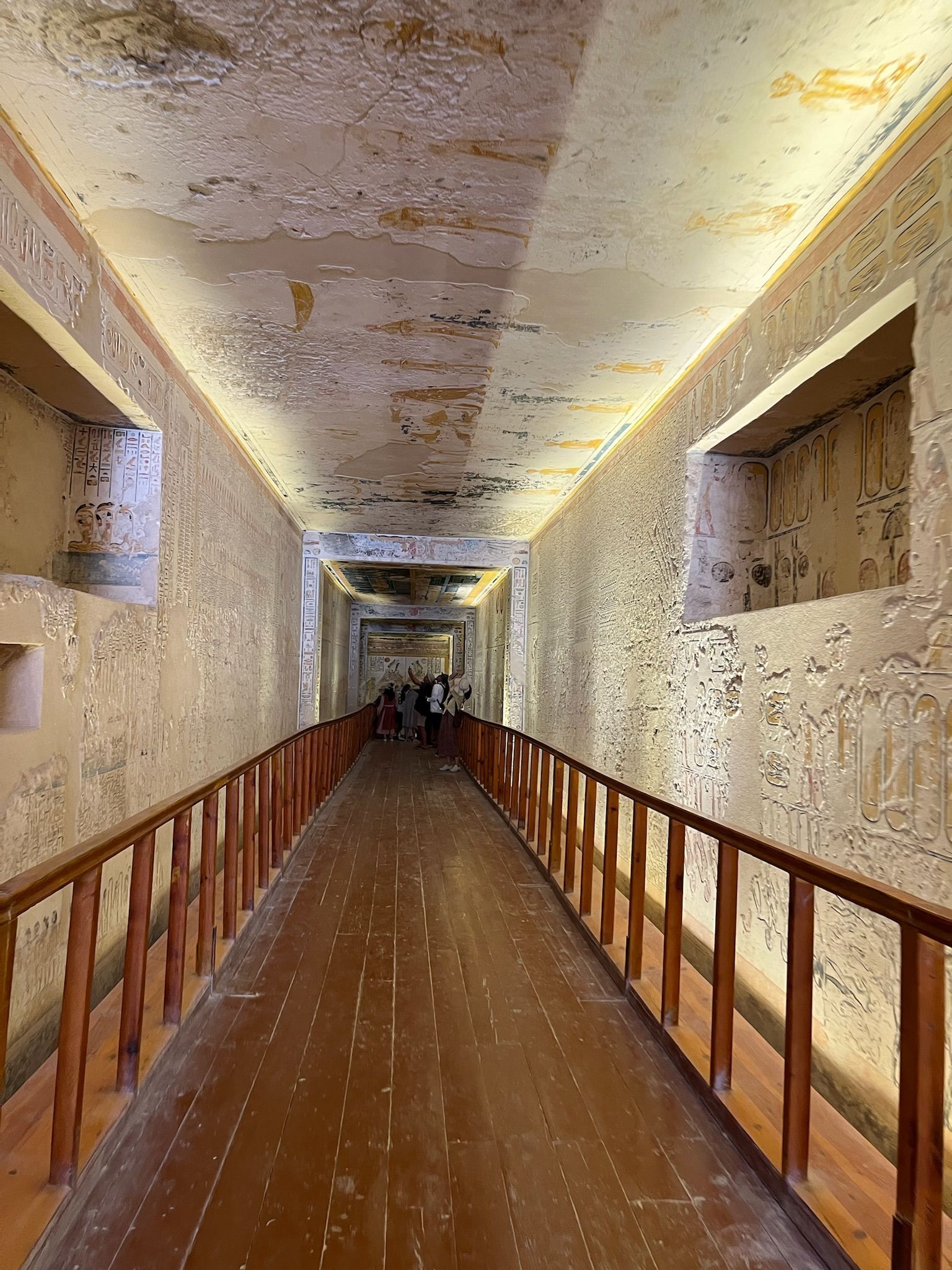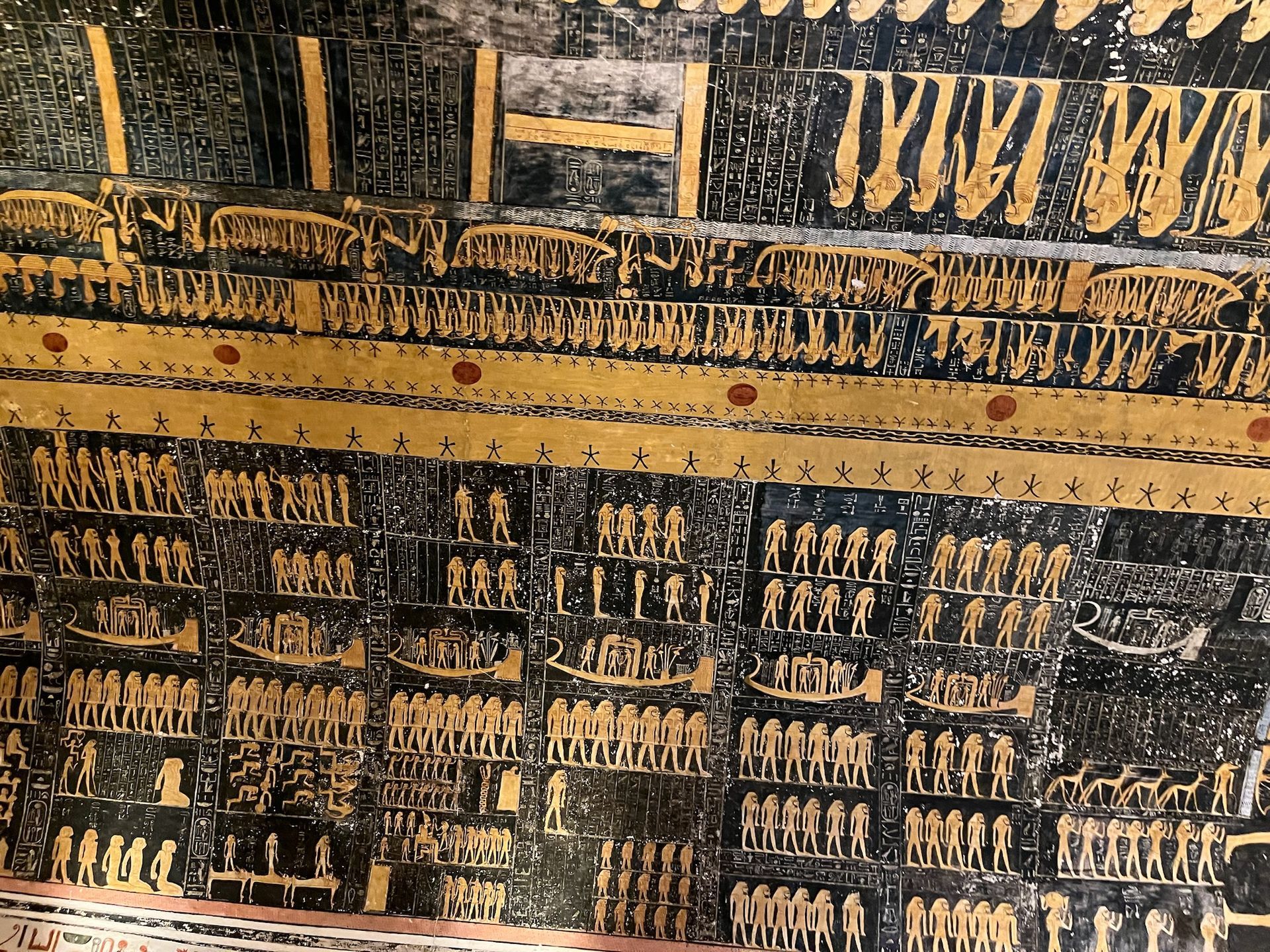 The sites we saw on our first full day in Luxor included – of course – multiple tombs in the (very hot) Valley of Kings (Ramses IV, Ramses IX, Merentptakh, Ramses V & VI, Tut-Ankh-Amun), the temples of Seti I, Medinat Habu, Hatshepsut (from a distance only), the Rameseum, and three tombs in the very interesting skilled-workers-village of Deir al-Medina. We also lunch at a local restaurant and visited an alabaster factory and a clothing story.