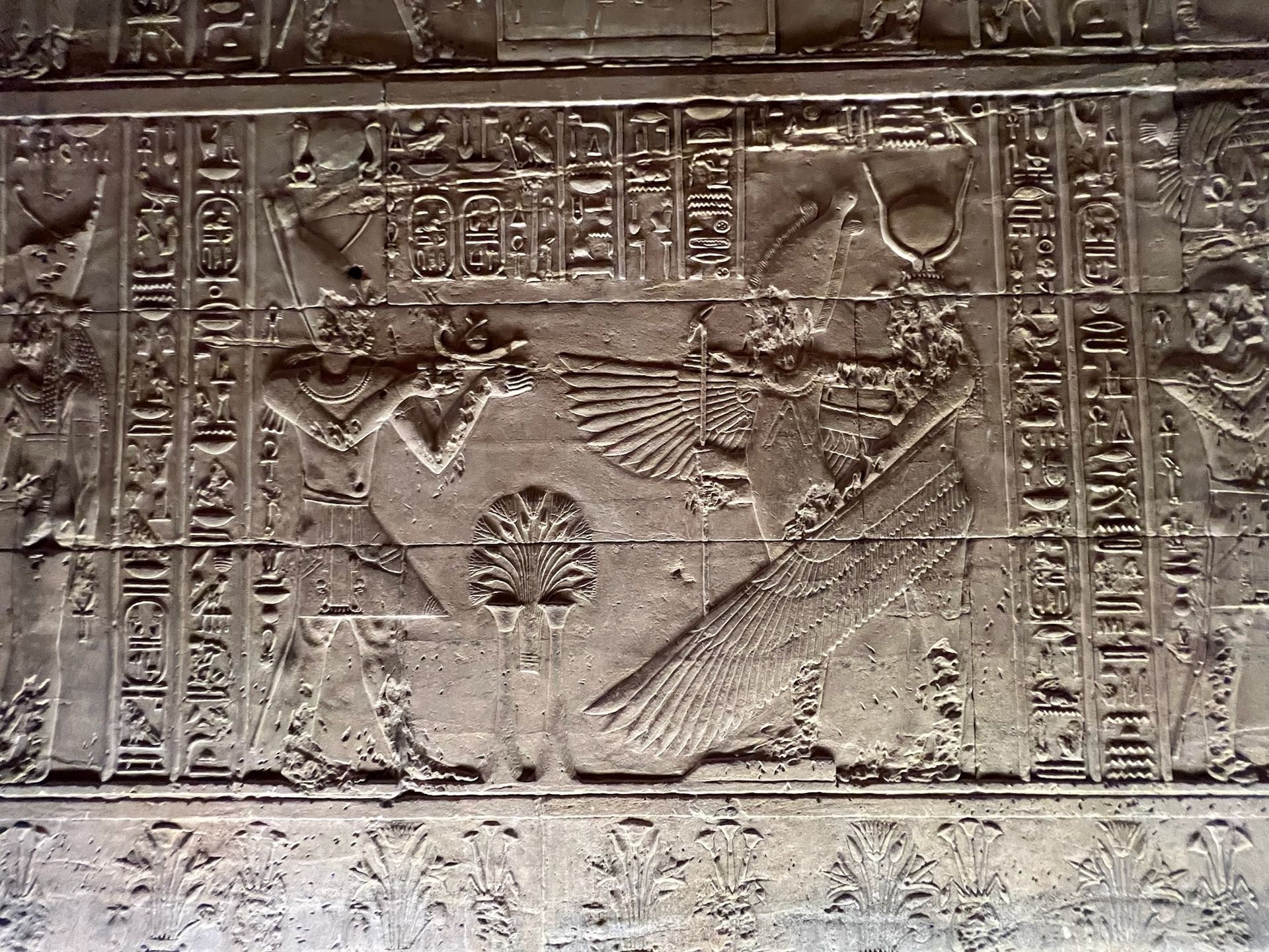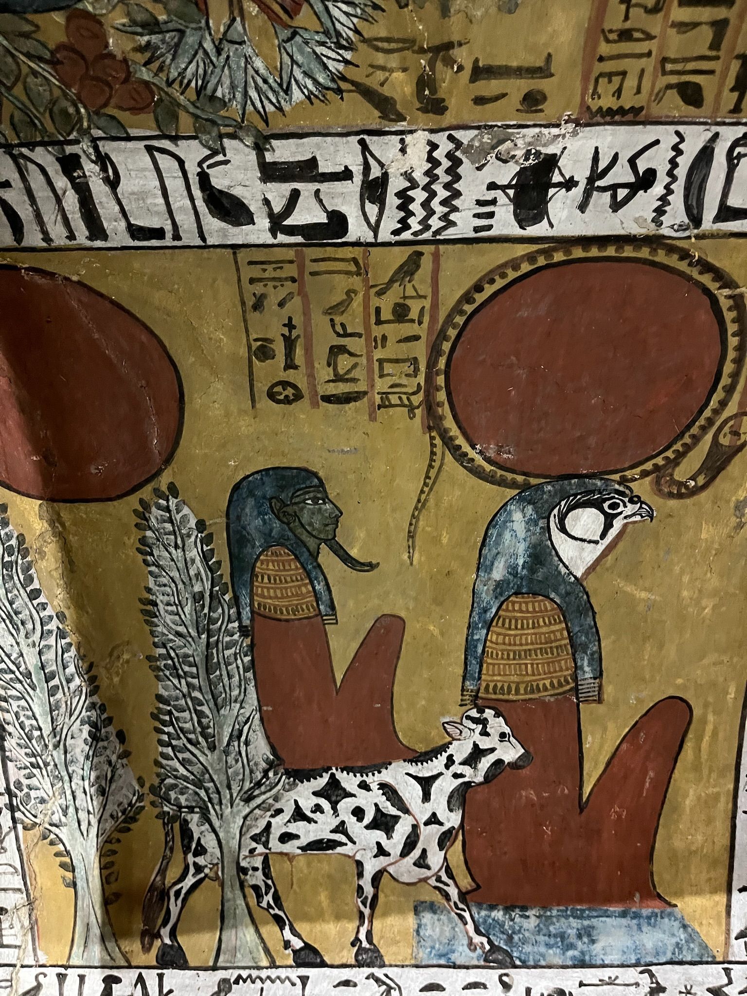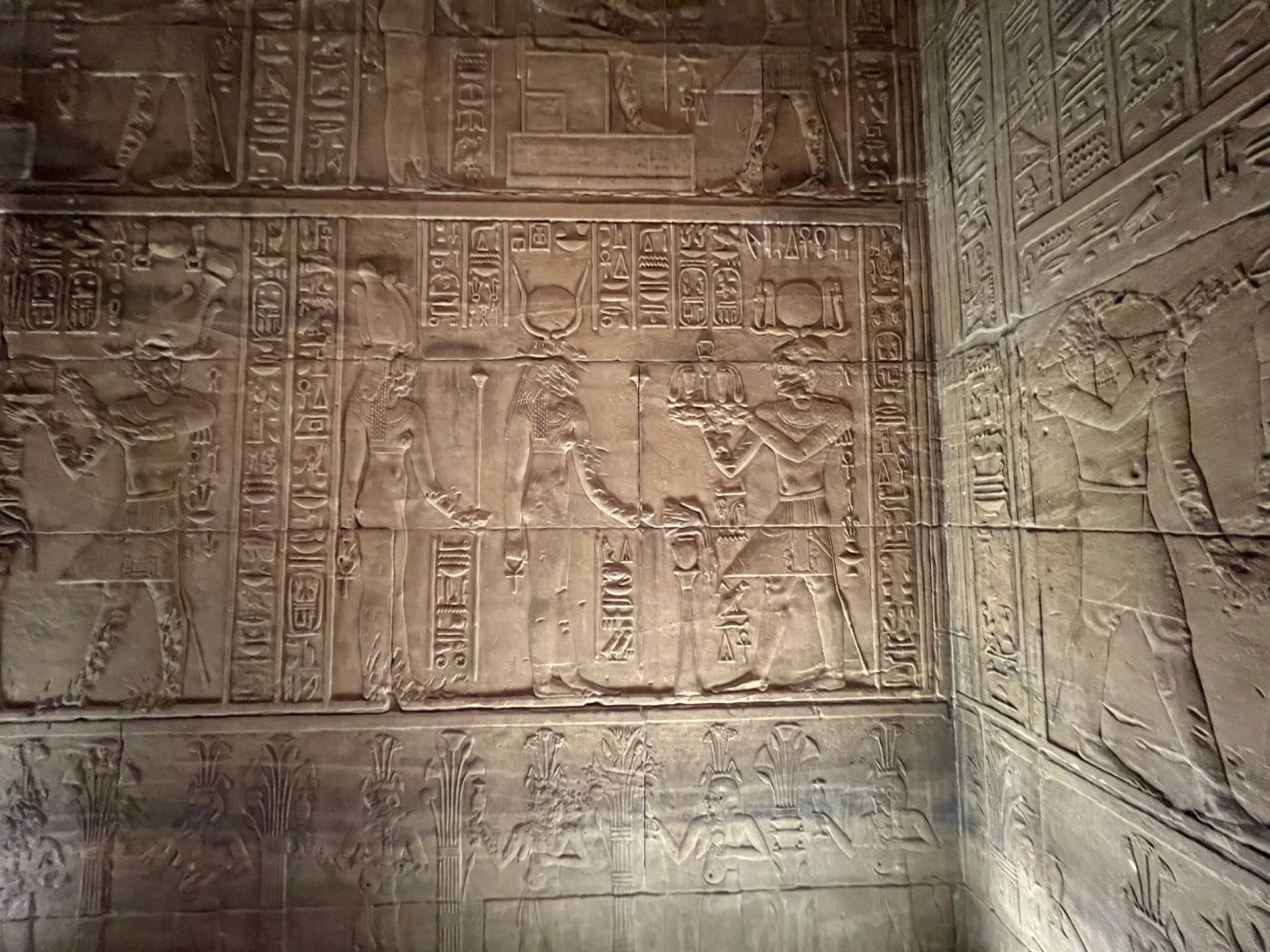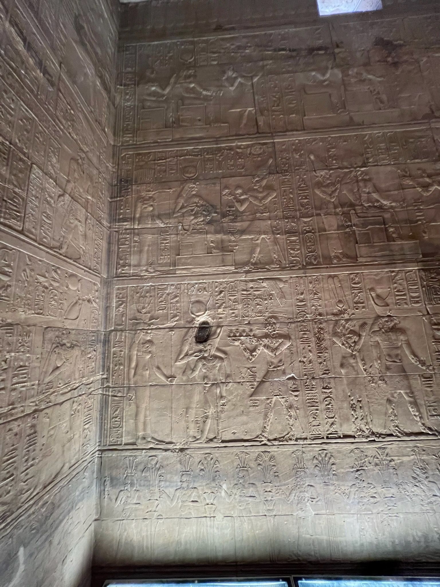 Little by little, Anna and I learnt to distinguish the insignia of certain deities, locate the king in certain scenes, and recognize the basic layout of temples. Temple compounds served many purposes – worship of deities (in return for hoped-for fertility of the land and of people, health, prosperity, power, and safety from Egypt’s enemies, and revival in the afterlife), meals for people, education, healthcare, storage of vast temple supplies (such as grain, linen, gold, and oils) and so forth. Adjacent to the temple were quarters for the king and members of the royal household. Together, the many temples were the second-largest landowners in ancient Egypt, and all those holdings were tax exempt.