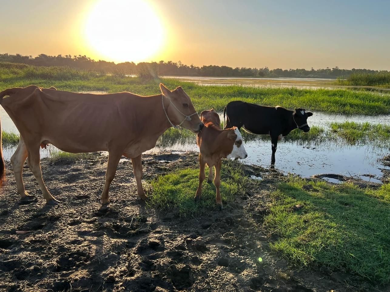 Cotton, rice, wheat, corn, sugarcane, sugar beets, onions, tobacco, and beans are the principal crops. Land is worked intensively and yields are high. Increasingly, a few modern techniques are applied to producing fruits, vegetables and flowers, in addition to cotton, for export. The most common traditional farms occupy 0.40 hectares (1 acre) each, typically in a canal-irrigated area along the banks of the Nile. Many small farmers also own cows, water buffalos, and chickens.