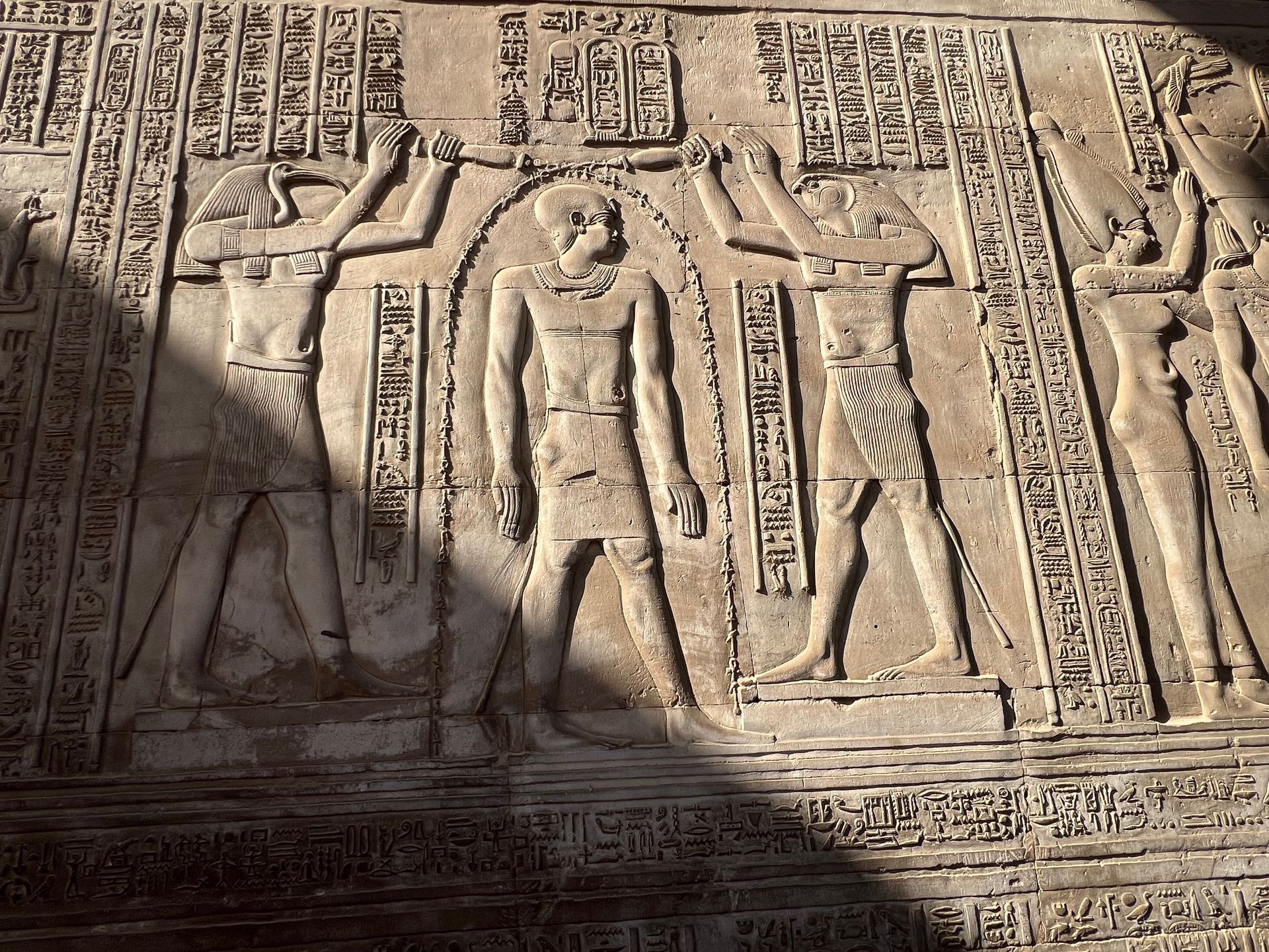 Other things we saw were Egyptian and Greco-Roman zodiac signs, a complete calendar of the Egyptian year (3 seasons of 4 months with each month consisting of 4 10-day weeks; plus 5 extra holidays dedicated to major deities), and a Nilometer (measuring the annual flood level as a predictor of the to-be-expected harvest, used for tax assessment). The last temple we visited (Kom Ombo) was built during the Ptolemaic (Hellenist) period. Kom Ombo was a medical temple at which priests would treat physically and mentally ill patients. The treatments included medicines, herbs, even surgeries. One relief showed a collection of instruments used (knifes, syringes, forceps, stethoscope, and linen gauze). Another one showed a woman giving birth in a swatting position.