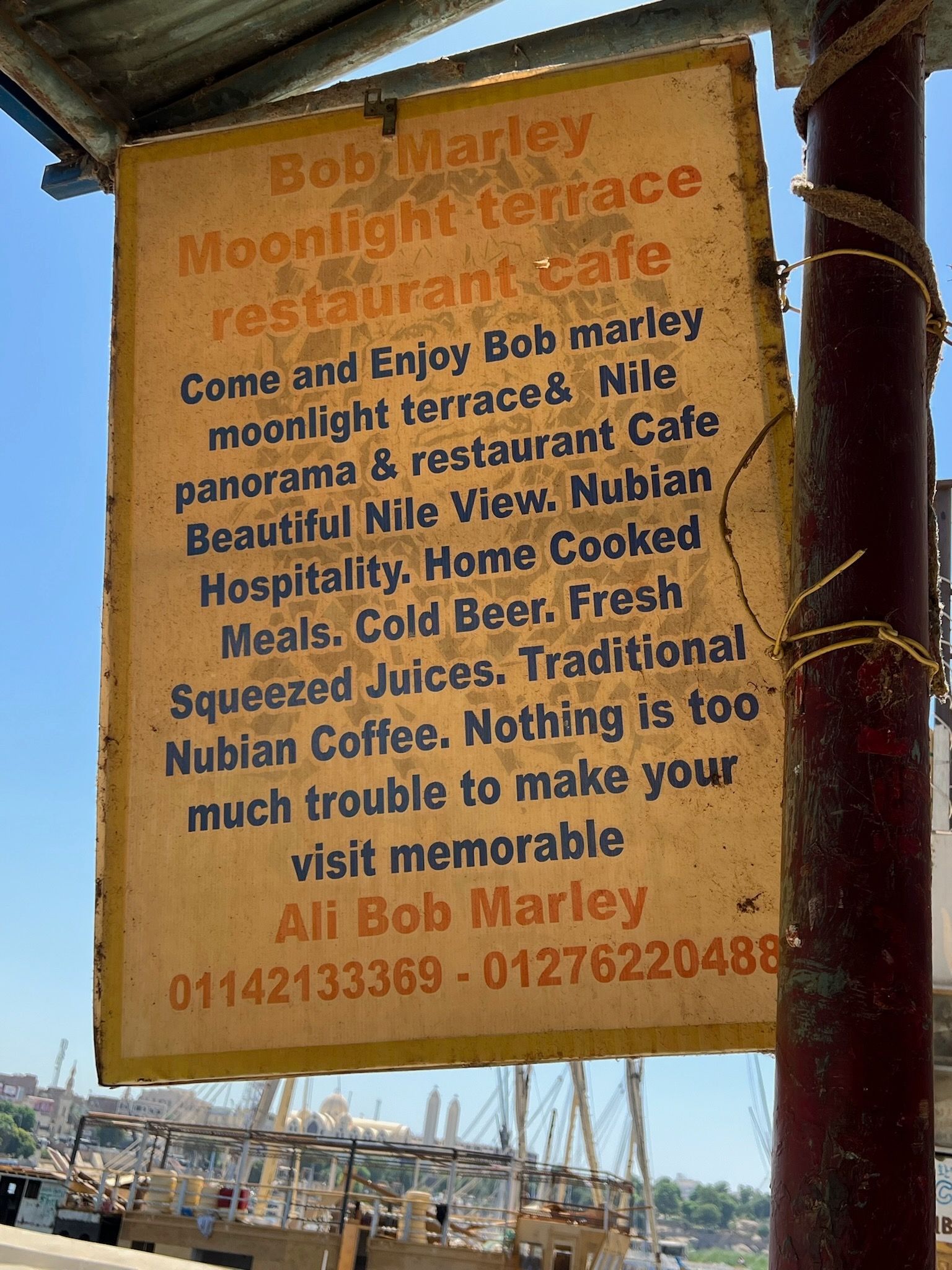 Aswan truly is an assault on one's senses. The fragrant lush air, the delicious Nubian-influenced food, the tasty fruit juices, coupled with tens of thousands of years of human history in the area. One of the latest additions to that history is Bob Marley's contribution to the musical tastes of the area.