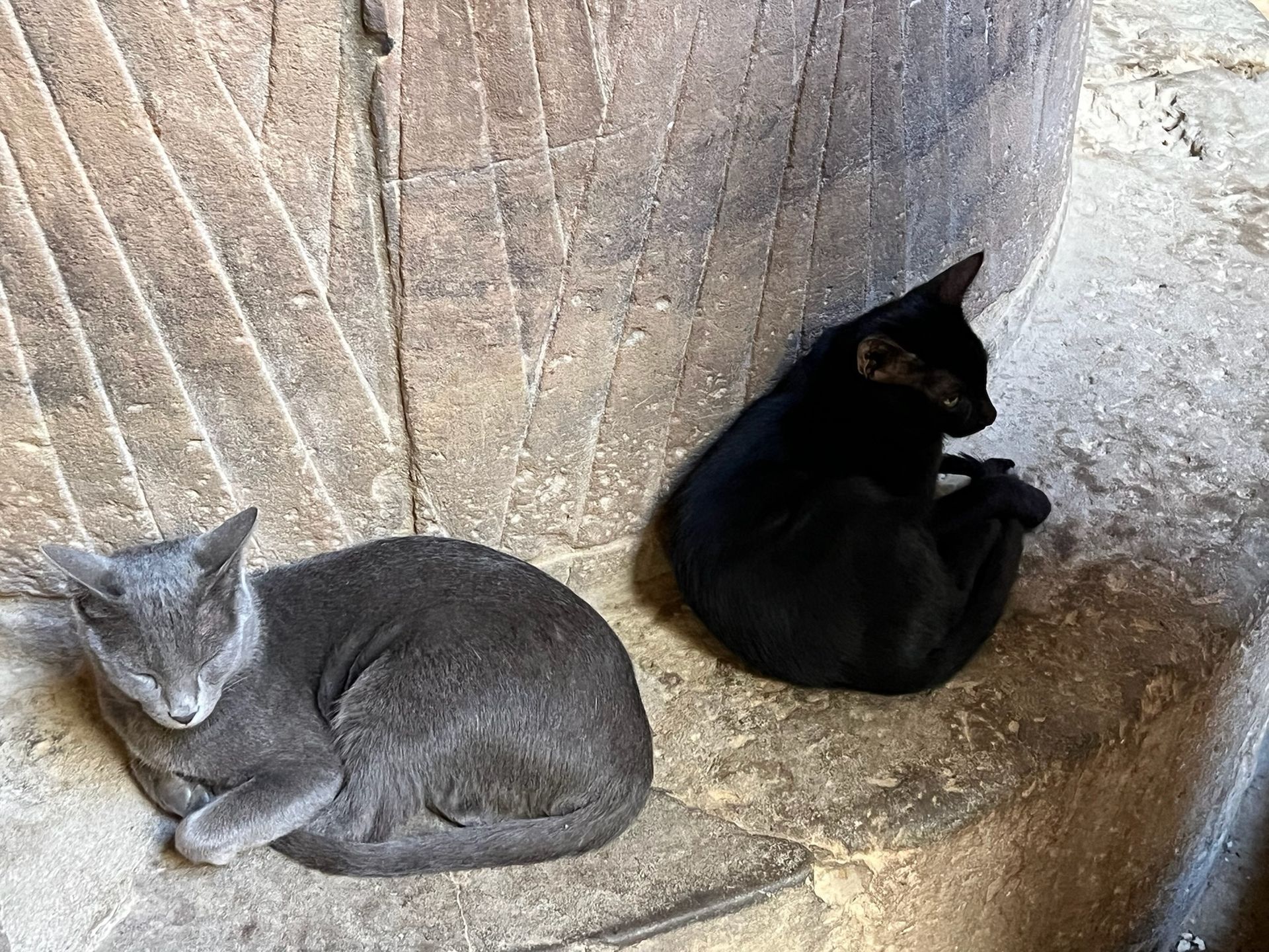 With the help of our guide, we visited four sites -- the Isis Temple on the island of Philae (including its famous cats), the ancient Coptic monastery of St. Simeon, the local market, and a spice shop. The Philae temple is famous for being moved to a higher island by UNESCO members during the building of the Nasser dam. The St. Simeon monastery impresses with both its location far away from the Nile or wells, and by the beauty of its two-story buildings. Visitors get to see the remains of the sanctuary, the abode of an earlier saintly hermit, the living quarters of the monks, as well as kitchen, dining, and storage facilities. Due to its vulnerability to attacks from desert tribes, the monastery was surrounded by a fortified wall. We learned that the monks offered respite to Muslim pilgrims on their way from North Africa to Mecca (as evidenced by ancient Arabic inscriptions). One the local market, we focussed on the food section, seeing pigeons, ducks, chickens, turkeys, and rabbits waiting in or on top of cages to be slaughtered later that day. Cats and dogs were eagerly waiting to be fed some of the waste.